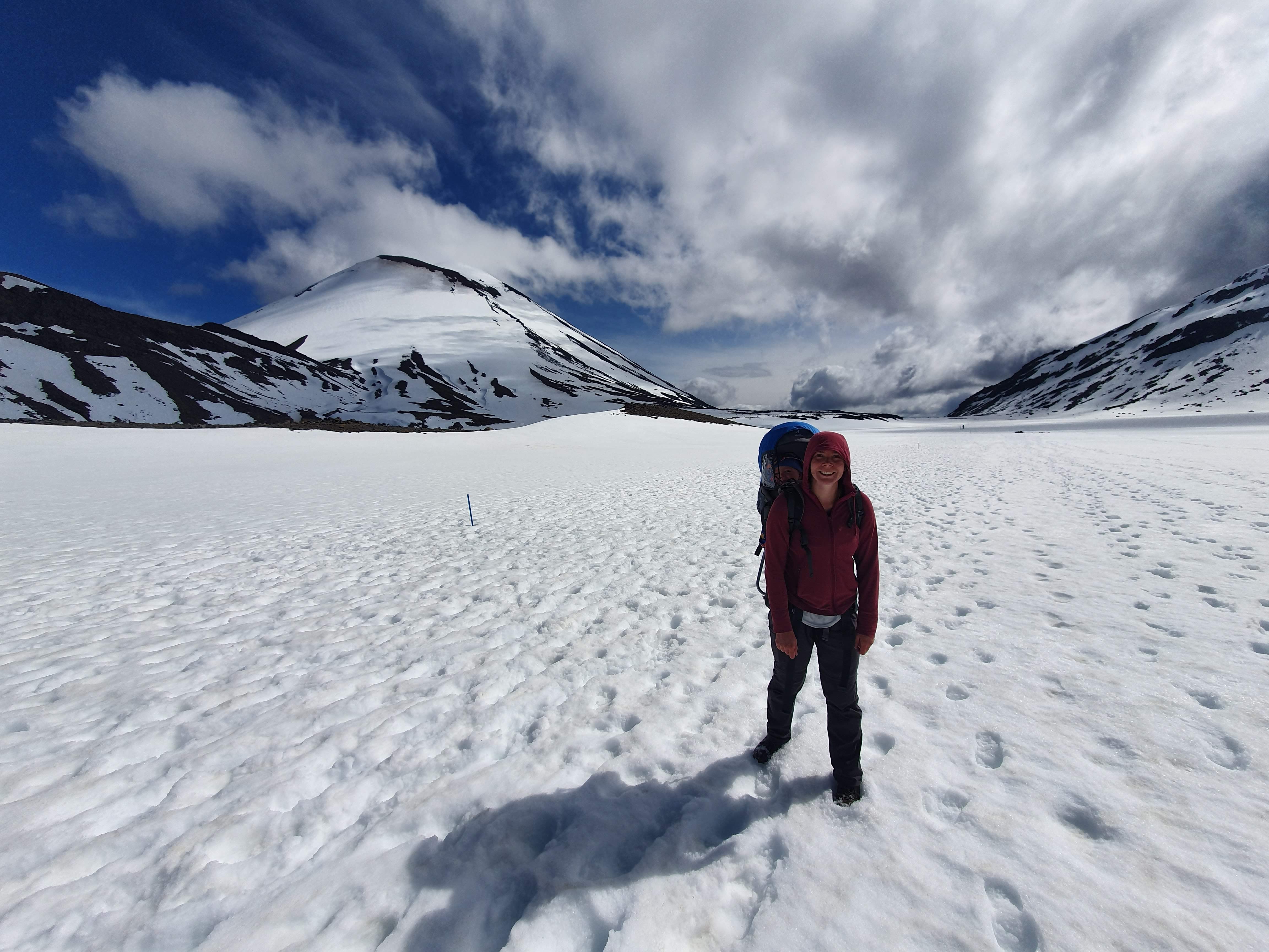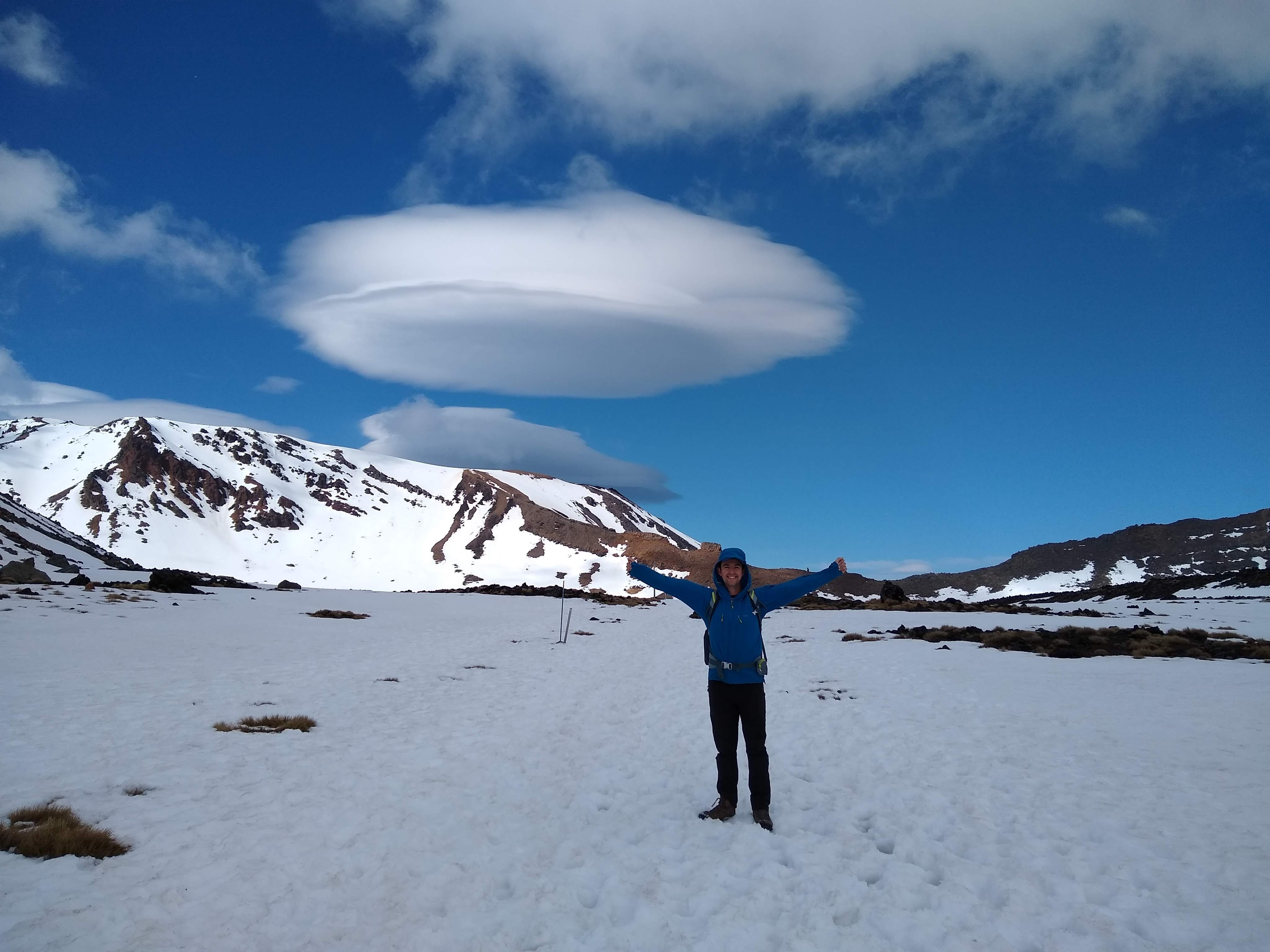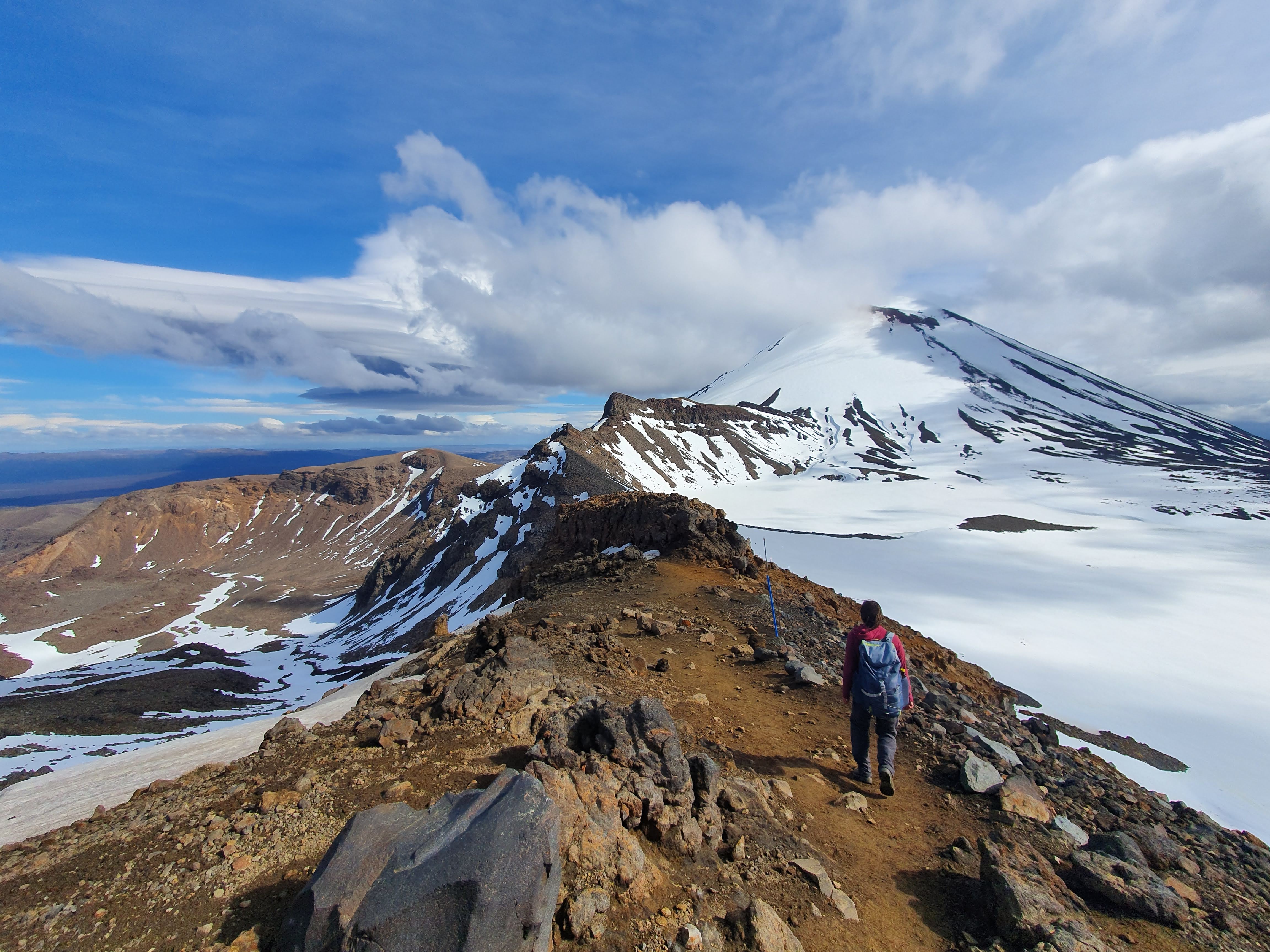 The day got better and better and we couldn’t resist climbing out of the valley past the underwhelming soda spring that we had been advised to go to at the visitor centre and up towards the southern crater. We pressed on, planning on continuing as long as the conditions remained good and see how far we got. We reached the southern crater rim to find dramatic views of mounts Tongariro and Ngauruhoe (the latter you may know as Mount Doom from Lord of the Rings), their peaks finally out of the clouds. We crossed the snow packed crater to more amazing views of the valley on the other side. At this point we got really ambitious, and started up the ridge towards the Red crater, the highest part of the crossing. We must have been really close to the rim when the winds picked up a bit more than we were happy with- not what we expected, the wind to drive us back instead of the snow! But it did, and we retraced our steps back to the van, happy with getting way further than we’d originally planned and with such awesome views!