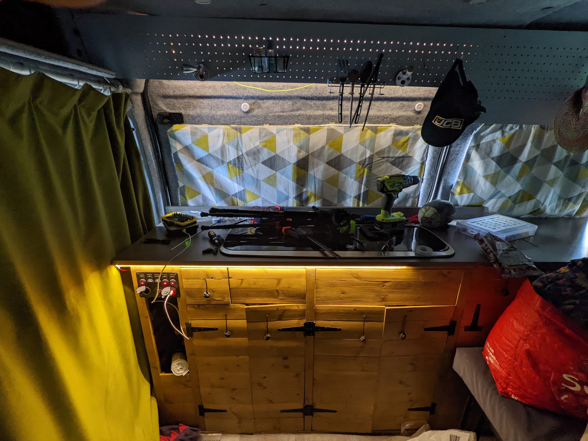 We made just a couple of modifications: Stripped, insulated, solar panel added, leisure batteries added, swivel seat for the front passenger to create a louge concept, rock n roll bed in the rear to give us a double bed and x2 rear belted seats, x2 shelves in the back for stuff / sleepy children, long kitchen unit with double gas hob and sink, wine rack, compressor fridge, a custom pegboard & many fancy lights.