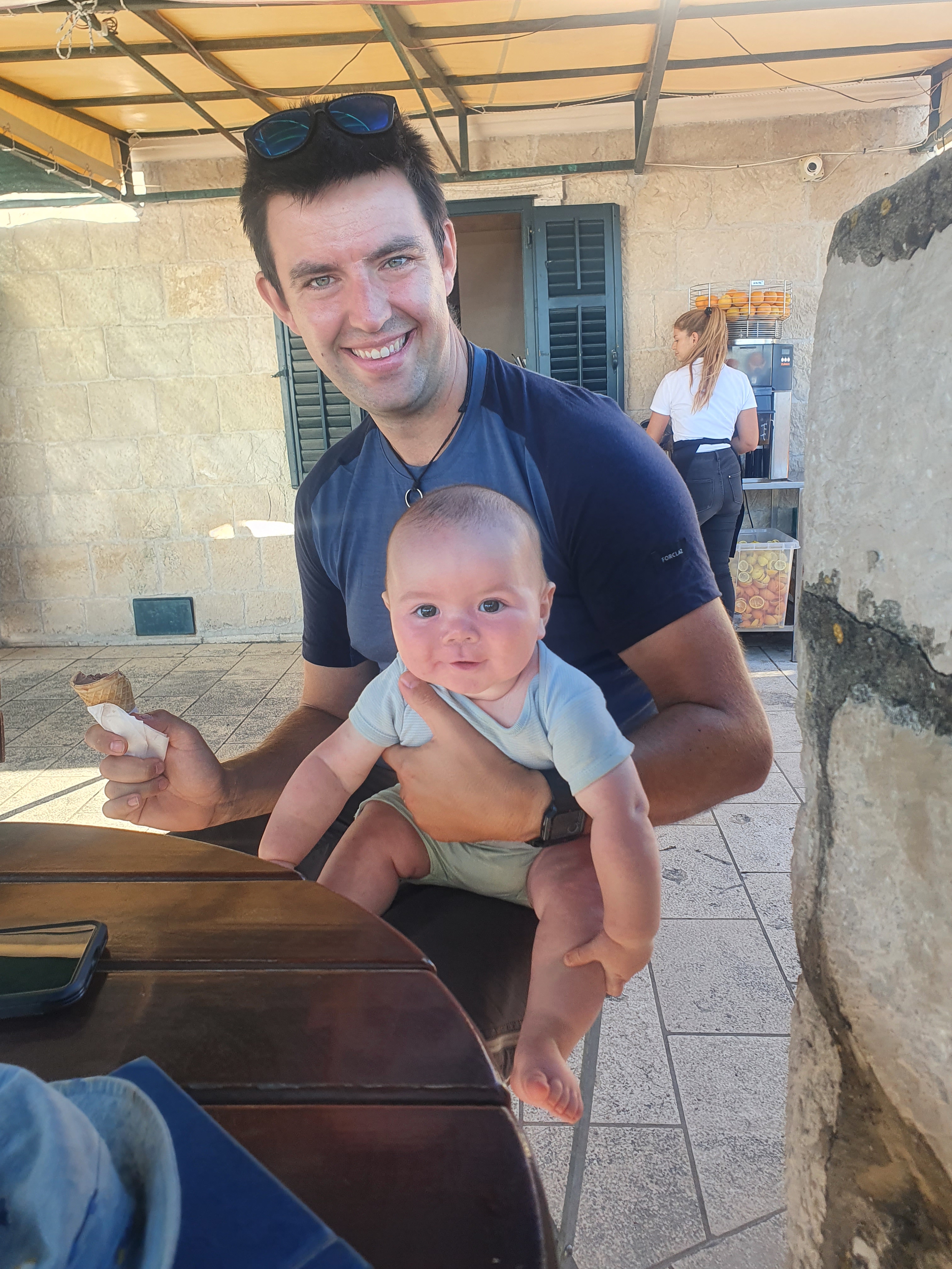 We wandered around the outside of the old fortress now war museum to the peak proper then got the cable car back to the city. There we had a pleasant mooch through the narrow marble-paved streets of the old town (Eddie’s fave new way to travel in Croatia is sliding- holding onto a hand each of mummy and daddy’s and basically being pushed along the shiny pavements).