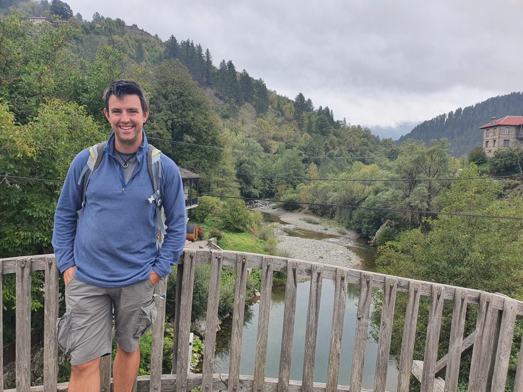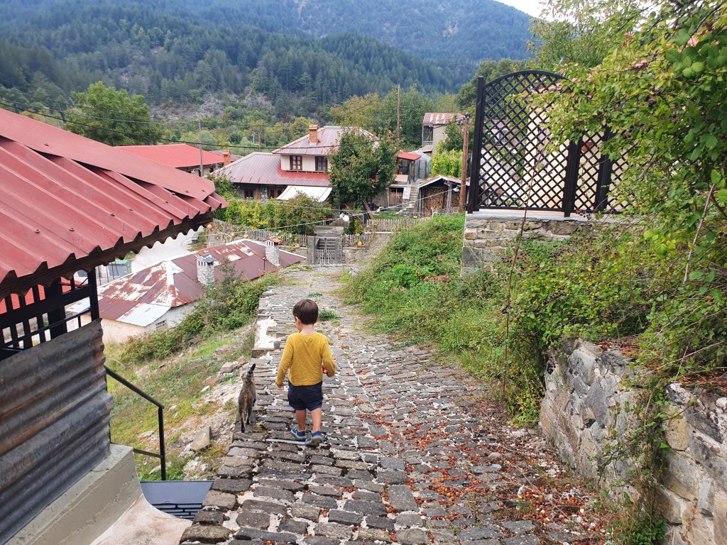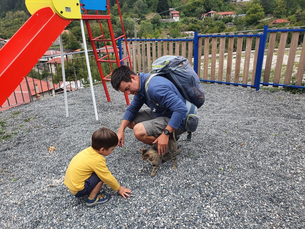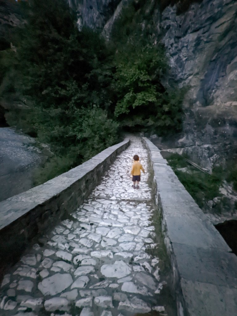 Deciding we’d done just enough walking in the threatening rain for one day we retreated to the local taverna, which gave us an incredible meal of local grilled meats and fried cheese which we all devoured (along with half a litre of wine for Adam) then drove down to the bottom of the gorge for a wander along the Portitsa ancient stone Bridge, admiring the cliffs behind it in the last of the daylight.