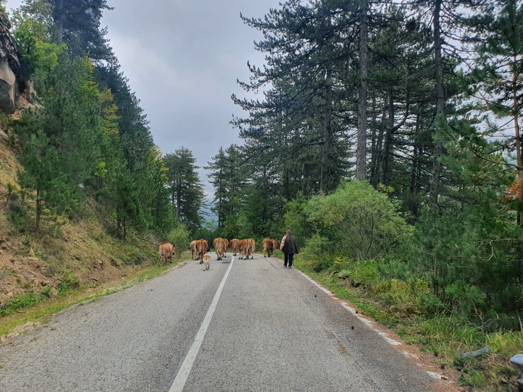 We woke up to our view of the mountains and clouds just high enough to justify a drive through the winding roads of the park to the other side of it, a village called Spilaio, stopping for a quick van lunch of sandwiches en route as everywhere we passed was closed at midday on a Monday!