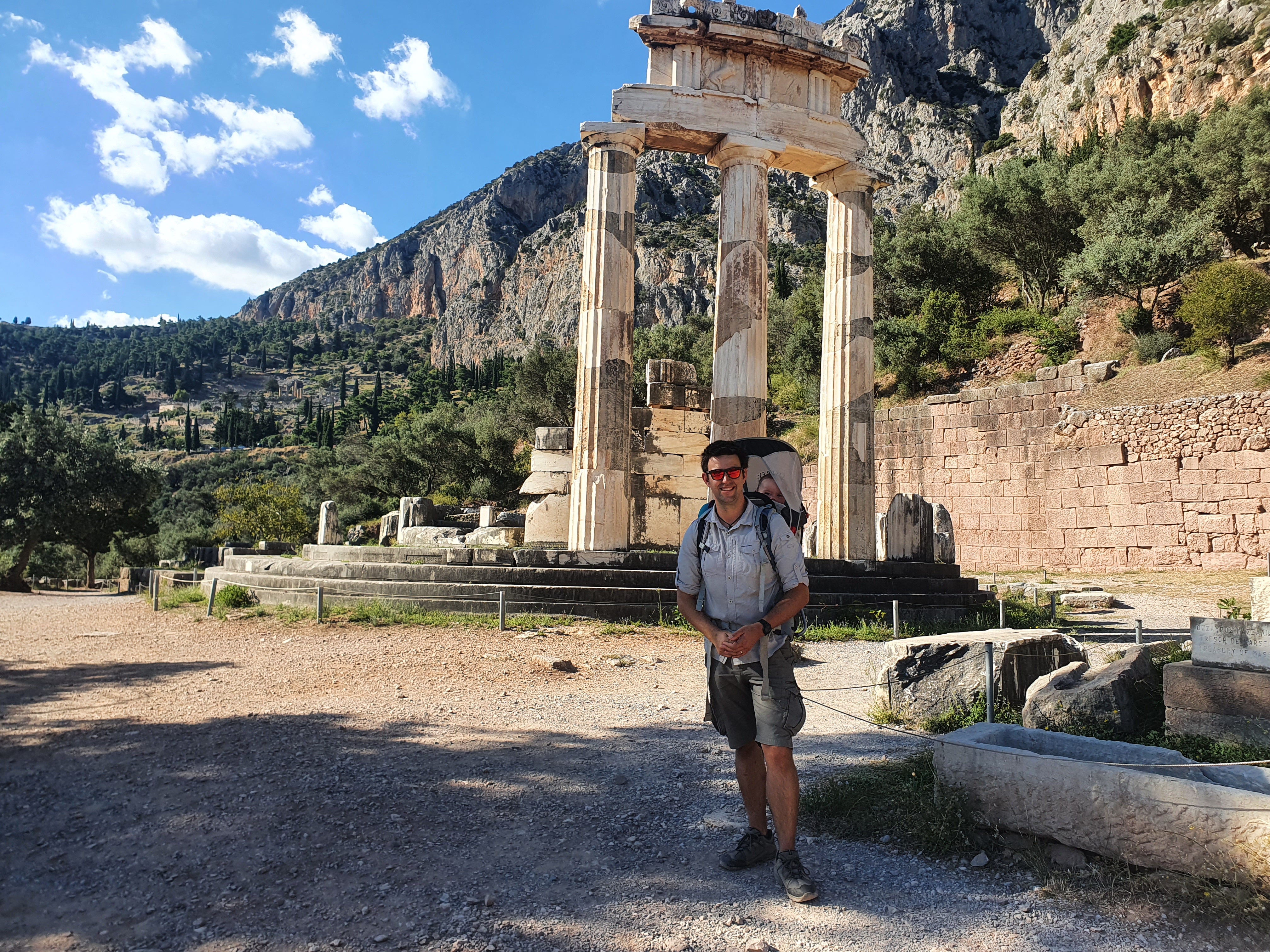 We finished this inside jaunt with a trip to the shop to reward Eddie for his patience with an Oydessey board game and van lunch then hit the archaeological site of Ancient Delphi itself. Thankfully the ancients enjoyed hillside spots so steps were very much a feature, and we zigzagging our way past the treasuries up to the temple to Apollo where the Oracle would inhale some fumes from a crack in the ground and yell a bit at some priests who would translate it into suitably vague predictions for the place to have a reputation for omnipotence.